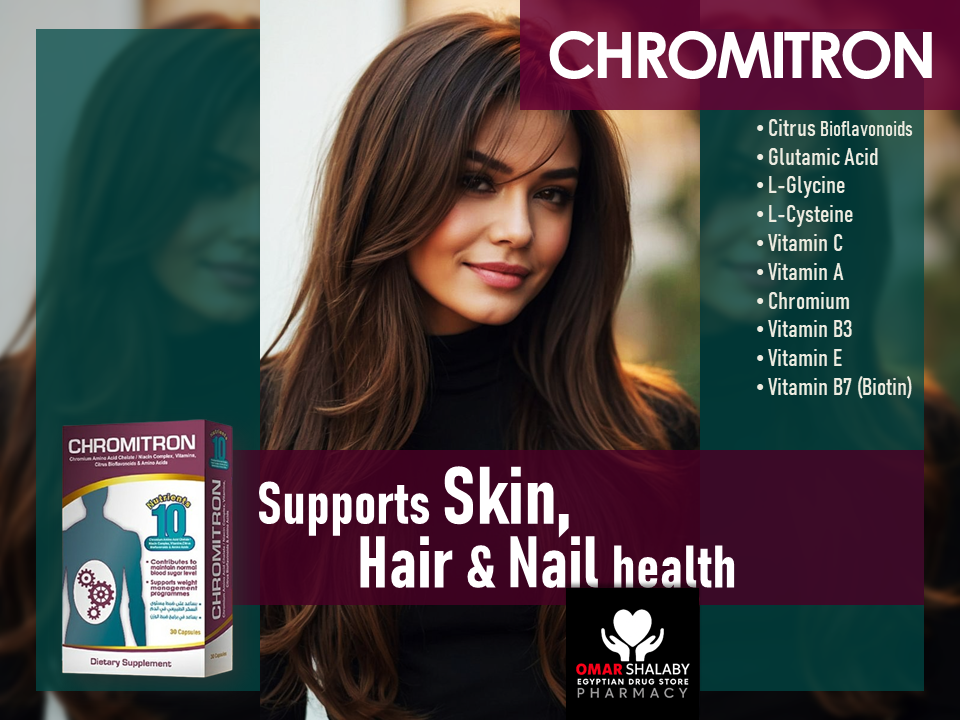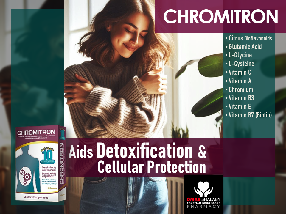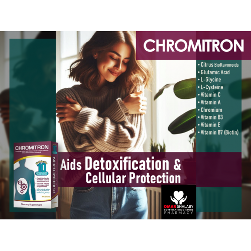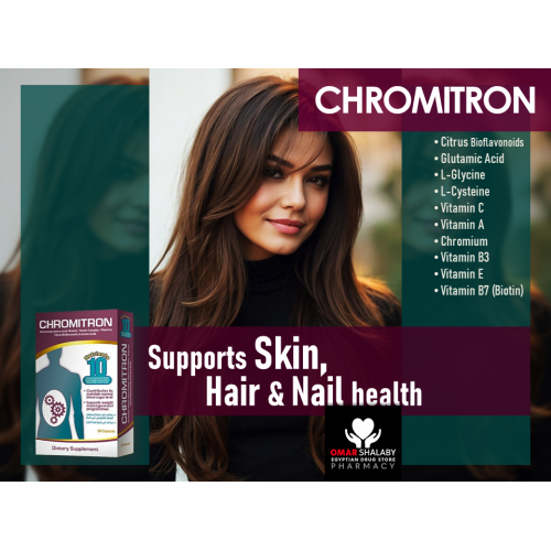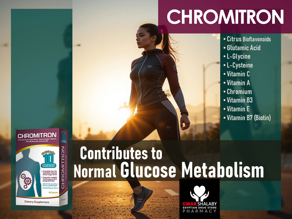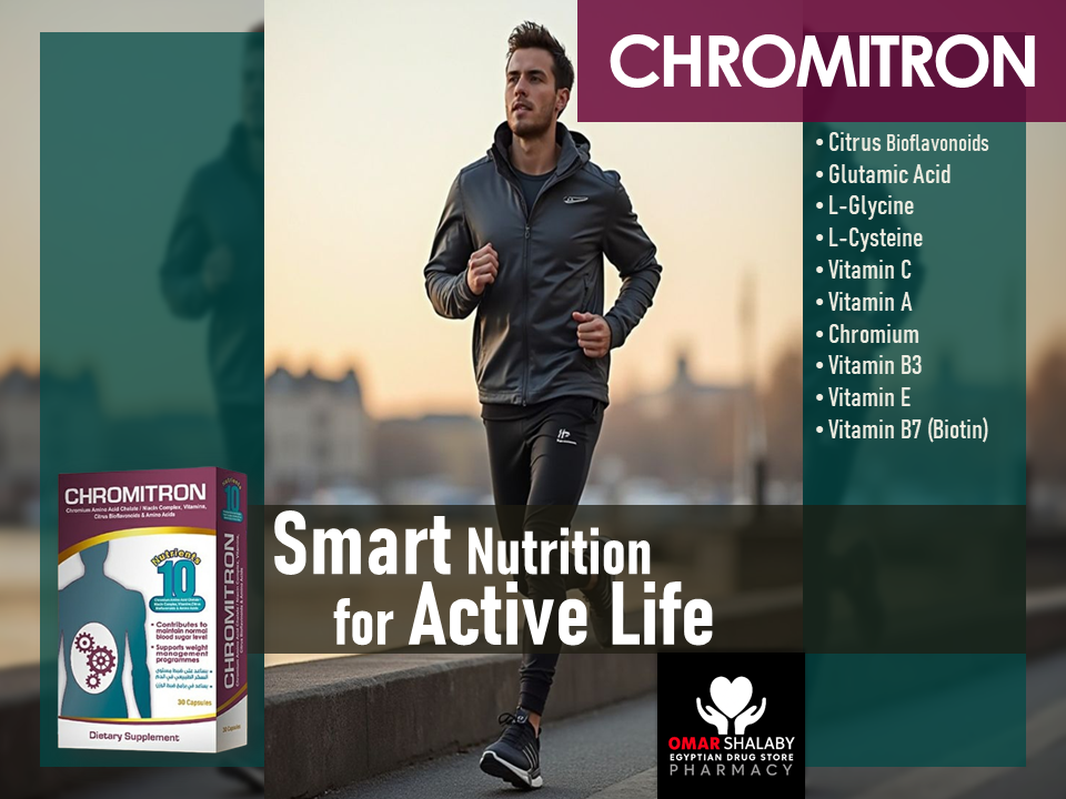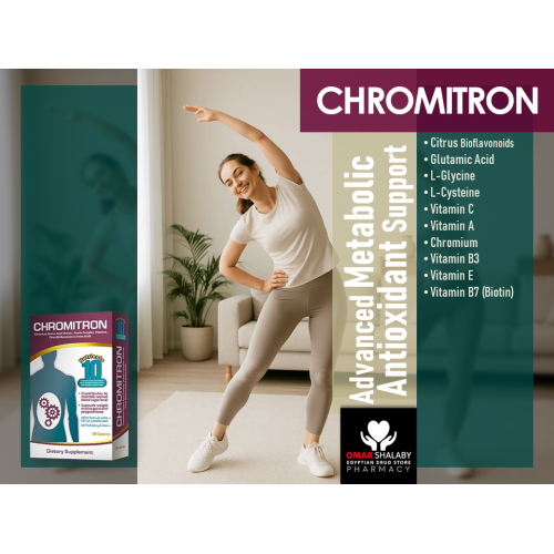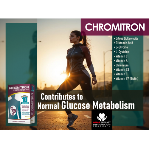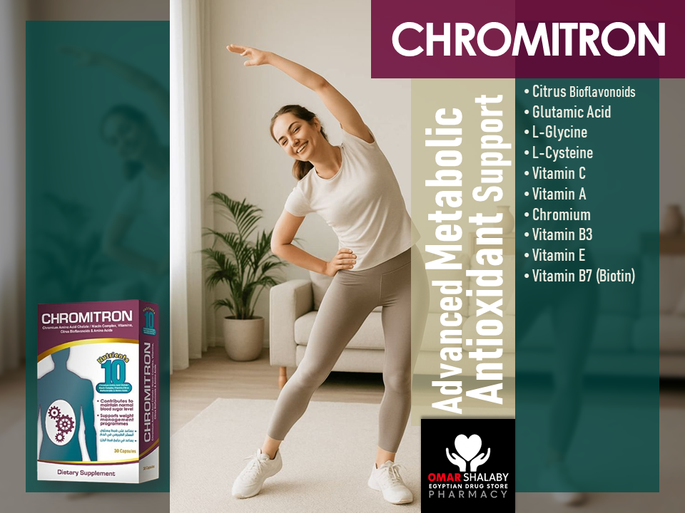 CHROMITRON contains a combination of amino acids, essential vitamins, chromium, and citrus bioflavonoids designed to support normal metabolic function, antioxidant defense, and overall nutritional status. L-glutamic acid, L-glycine, and L-cysteine serve as important building blocks for proteins and play roles in cellular metabolism, detoxification pathways, and antioxidant systems. Vitamin C, vitamin E, and citrus bioflavonoids provide antioxidant support, helping protect cells from oxidative stress and supporting immune and vascular health. Vitamin A contributes to normal vision, immune function, and cellular differentiation. Chromium supports normal glucose metabolism and insulin function, while niacin (vitamin B3) and biotin (vitamin B7) contribute to energy metabolism and the maintenance of healthy skin, hair, and nails. Together, these nutrients help support metabolic balance, cellular protection, and general wellbeing, particularly in individuals with increased nutritional requirements.