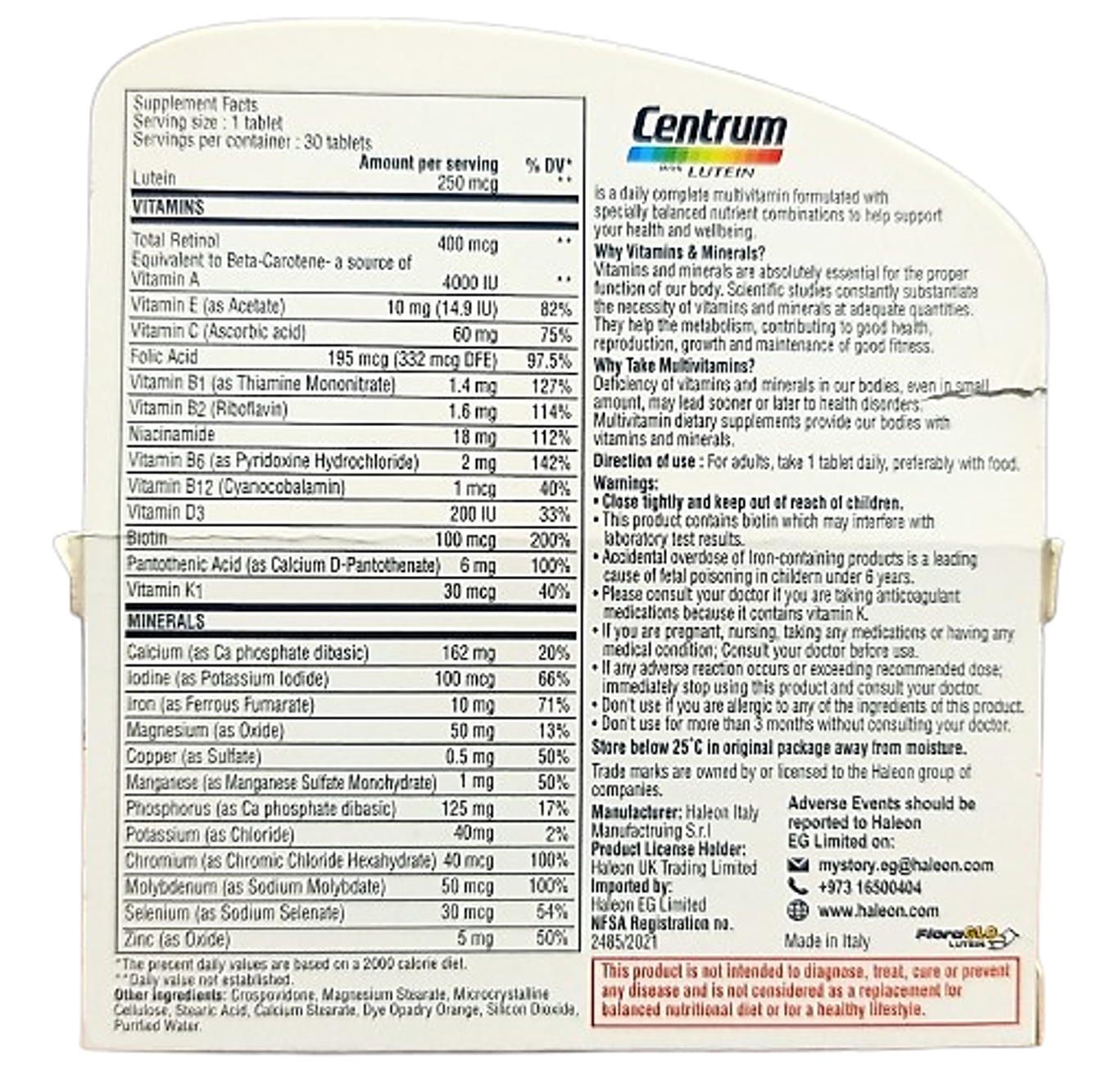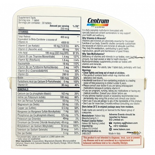 CENTRUM WITH LUTEIN COMPLETE FROM A TO ZINC MULTIVITAMIN DIETARY SUPPLEMENT 30 TABLETS