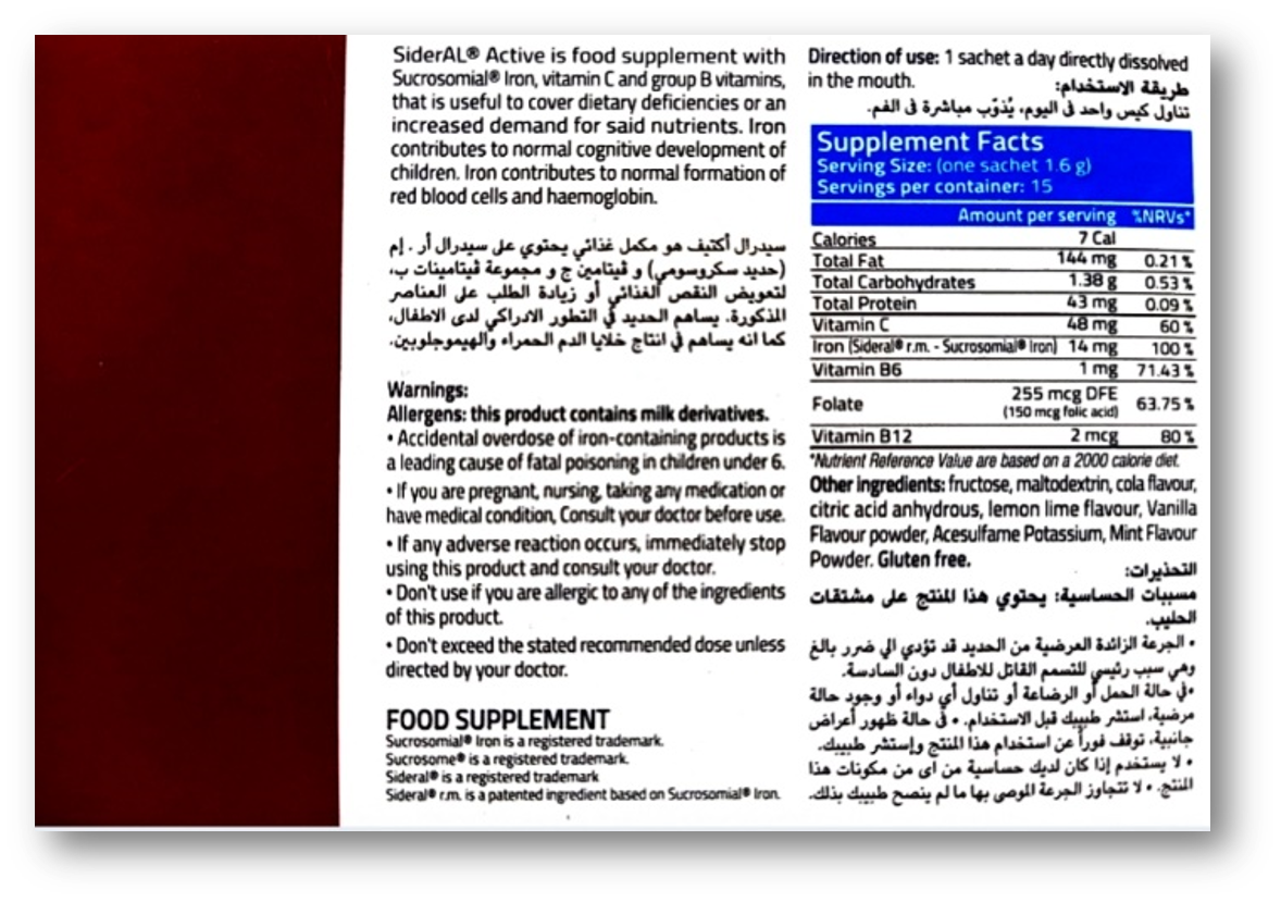 SIDERAL ACTIVE MOUTH-DISPERSIBLE IRON & VITAMINS FOOD SUPPLEMENT 15 STICKS NET WEIGHT 24 G