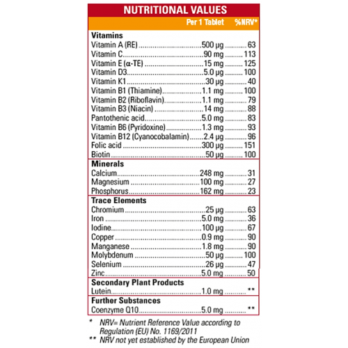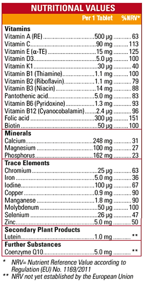 Calcium carbonate; L-ascorbic acid; hydroxypropyl cellulose; DL-alpha-tocopheryl acetate; marigold flower extract (1.32%); anti-caking agents (magnesium salts of fatty acids, silicon dioxide); ferrous (II) sulphate; nicotinamide; selenium-enriched yeast; chromium-enriched yeast; copper (II) gluconate; zinc oxide; calcium D-pantothenate; manganese (II) sulphate monohydrate; coenzyme Q10; pyridoxine hydrochloride; thiamine mononitrate; riboflavin; retinyl acetate; pteroylmonoglutamic acid; potassium iodide; sodium molybdate; D-biotin; phylloquinone; cholecalciferol; cyanocobalamin.