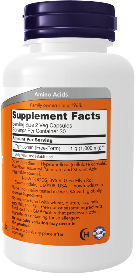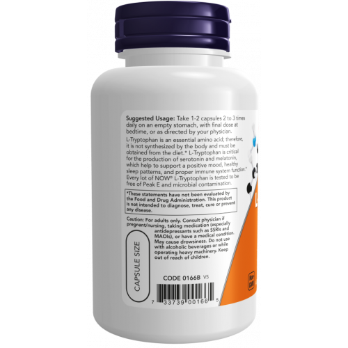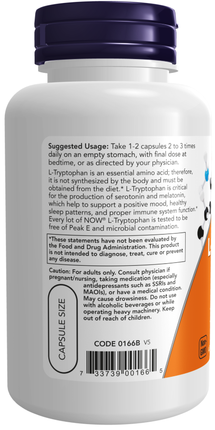 L-Tryptophan is an essential amino acid; therefore, it is not synthesized by the body and must be obtained from the diet.* L-Tryptophan is critical for the production of serotonin and melatonin, which help to support a positive mood, healthy sleep patterns, and proper immune system function.* Every lot of NOW® L-Tryptophan is tested to be free of Peak E and microbial contamination.