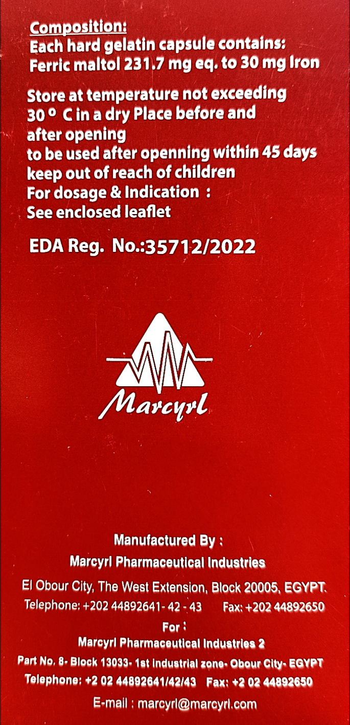 Each hard gelatin capsule delivers 231.7 mg ferric maltol, equivalent to 30 mg of elemental iron.
