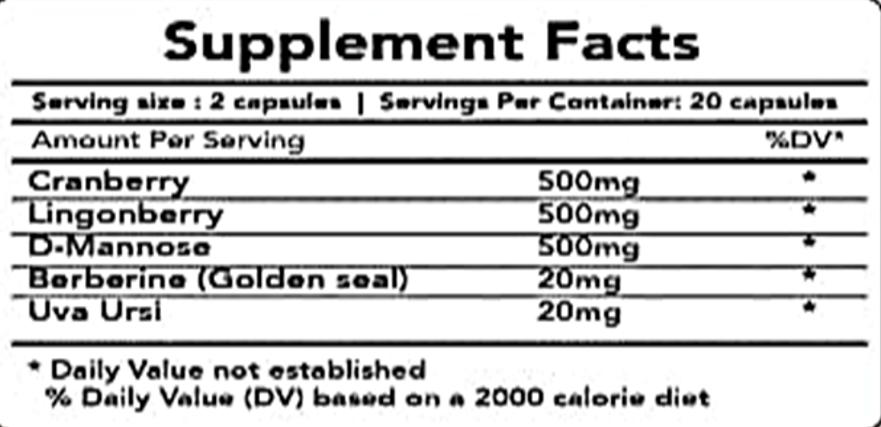 Cranberry and lingonberry supply proanthocyanidins that help prevent bacterial adhesion to the urinary tract lining, while D-mannose aids in flushing bacteria from the urinary system. Berberine and uva ursi contribute antimicrobial and mild anti-inflammatory effects.