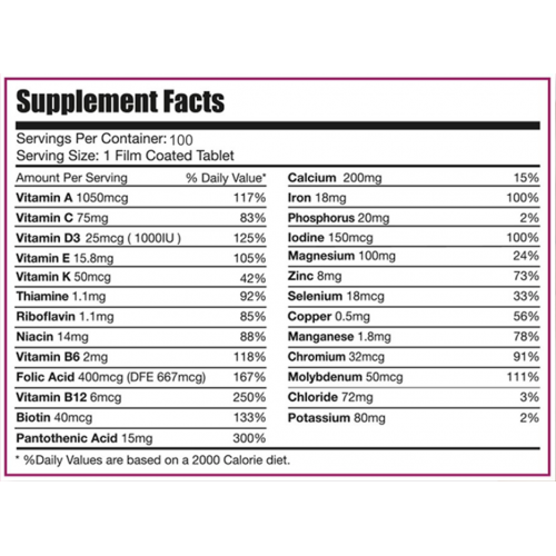 containing 26 of the most important vitamins and minerals that the body needs on a daily basis, such as vitamins A, B, C, D, E, K, and minerals such as calcium, iron, zinc, and chromium.