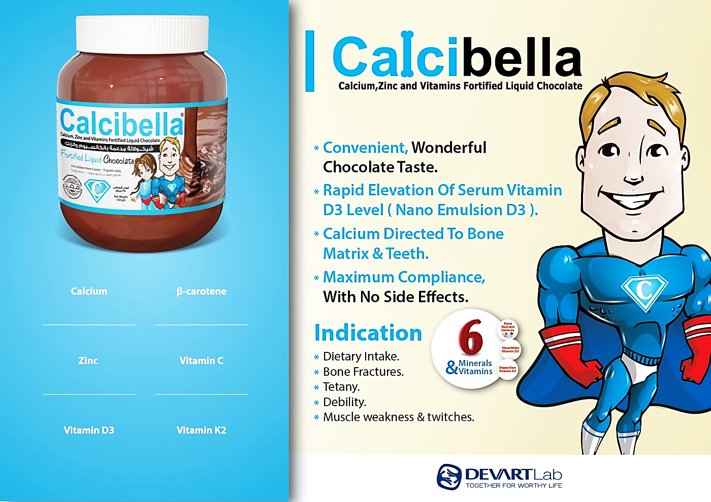 Calcibella is the first fortified calcium in wonderful chocolate form, containing 6 active ingredients which provides maximum absorption and deposition of calcium into targeted tissue in bones and teeth