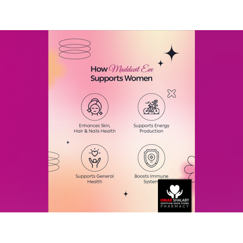 Energy: MADDOVIT EVE Contribute to normal energy-yielding metabolism due to: Copper, lodine, Iron, Magnesium, Manganese, Phosphorus, Vitamin C, and B Vitamins.