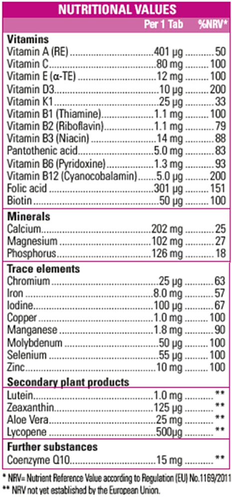 Calcium hydrogen phosphate; magnesium oxide; calcium carbonate; coating (glazing agents: hydroxypropyl methylcellulose, hydroxypropylcellulose; stabiliser: glycerol; bulking agents: microcrystalline cellulose, calcium carbonate; colours: potassium aluminium silicate, iron oxide); L-ascorbic acid; zinc gluconate; hydroxypropylcellulose; selenium-enriched yeast; 1.82% aloe vera extract; ferrous(II) fumarate; anti-caking agents: magnesium salts of fatty acids, silicon dioxide; DL-alpha-tocopheryl acetate; coenzyme Q10; nicotinamide; chromium-enriched yeast; copper(II) gluconate; calcium D-pantothenate; manganese(II) sulphate monohydrate; 0.36% marigold flower extract (of which lutein and zeaxanthin); 0.36% tomato fruit extract (of which lycopene); pyridoxine hydrochloride; riboflavin-5′-phosphate sodium; thiamine mononitrate; retinyl acetate; pteroylmonoglutamic acid; potassium iodide; sodium molybdate; D-biotin; phylloquinone; cholecalciferol; cyanocobalamin.