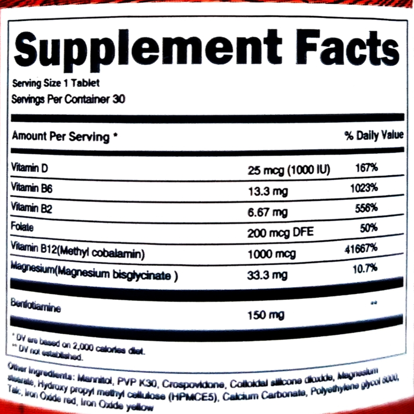 - Vitamin B12 (Methyl cobalamin) — 1000 mcg — 41667%