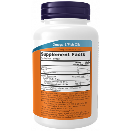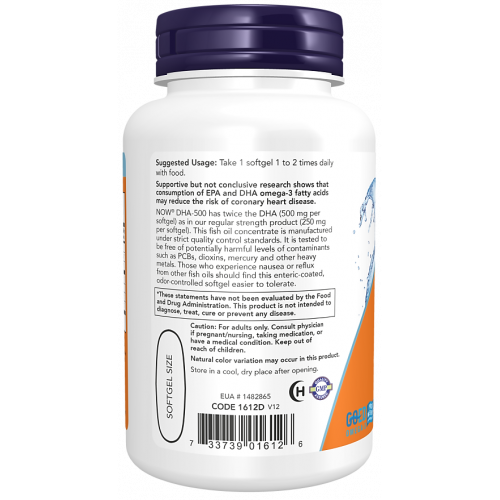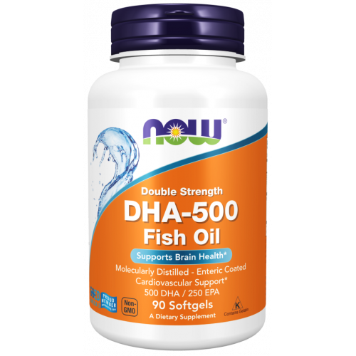 NOW® DHA-500 Docosahexaenoic Acid has twice the DHA (500 mg per softgel) as in our regular strength product (250 mg per softgel). This fish oil concentrate is manufactured under strict quality control standards. It is tested for potentially harmful levels of contaminants such as PCBs, dioxins, mercury and other heavy metals. Those who experience nausea or reflux from other fish oils should find this enteric-coated, odor-controlled softgel easier to tolerate.