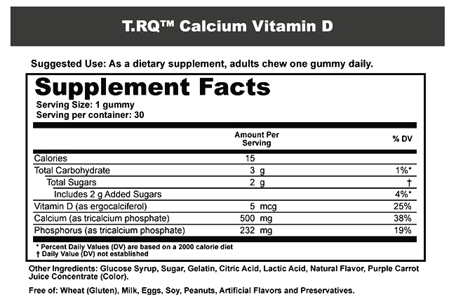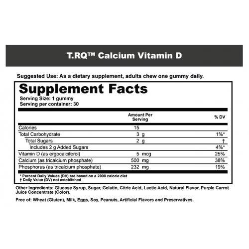 T.RQ Calcium is a very important mineral, which helps the body build and maintain strong bones. Vitamin D helps the body absorb the necessary amount of calcium needed. T-RQ Calcium Plus Vitamin D contains a powerful combination of both in order to help keep bones strong and healthy.