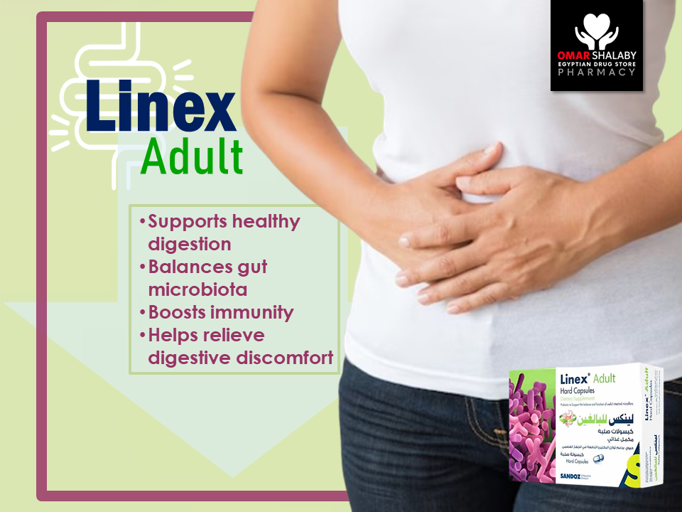 Linex® Adult supports healthy digestion, balances gut microbiota, boosts immunity, and helps relieve digestive discomfort caused by antibiotics or dietary imbalance.