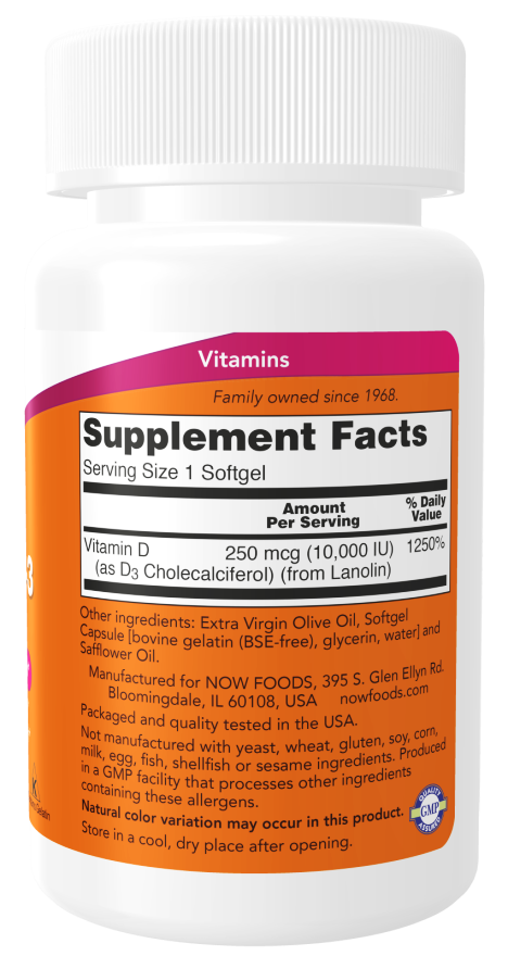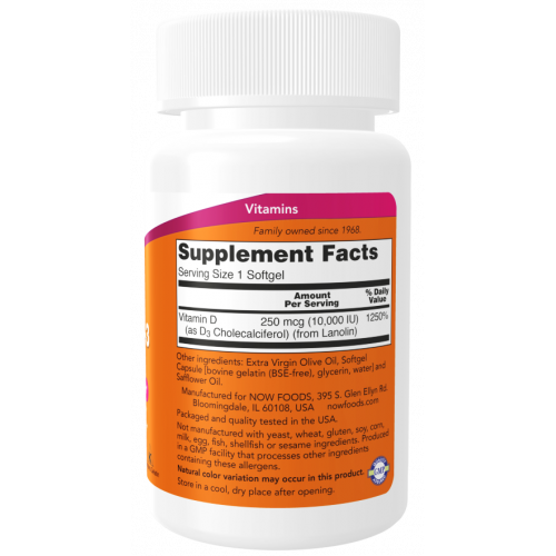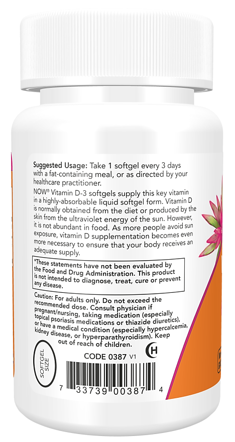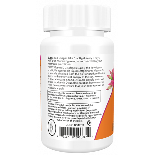 NOW® Vitamin D3 softgels supply this key vitamin in a highly-absorbable liquid softgel form. Vitamin D is normally obtained from the diet or produced by the skin from the ultraviolet energy of the sun. However, it is not abundant in food. As more people avoid sun exposure, vitamin D supplementation becomes even more necessary to ensure that your body receives an adequate supply.