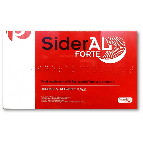 Sideral® Forte Capsules is a food supplement containing Sideral® r.m. (Sucrosomial® Iron) and vitamins. It is useful for covering dietary deficiencies or meeting increased nutritional demands.