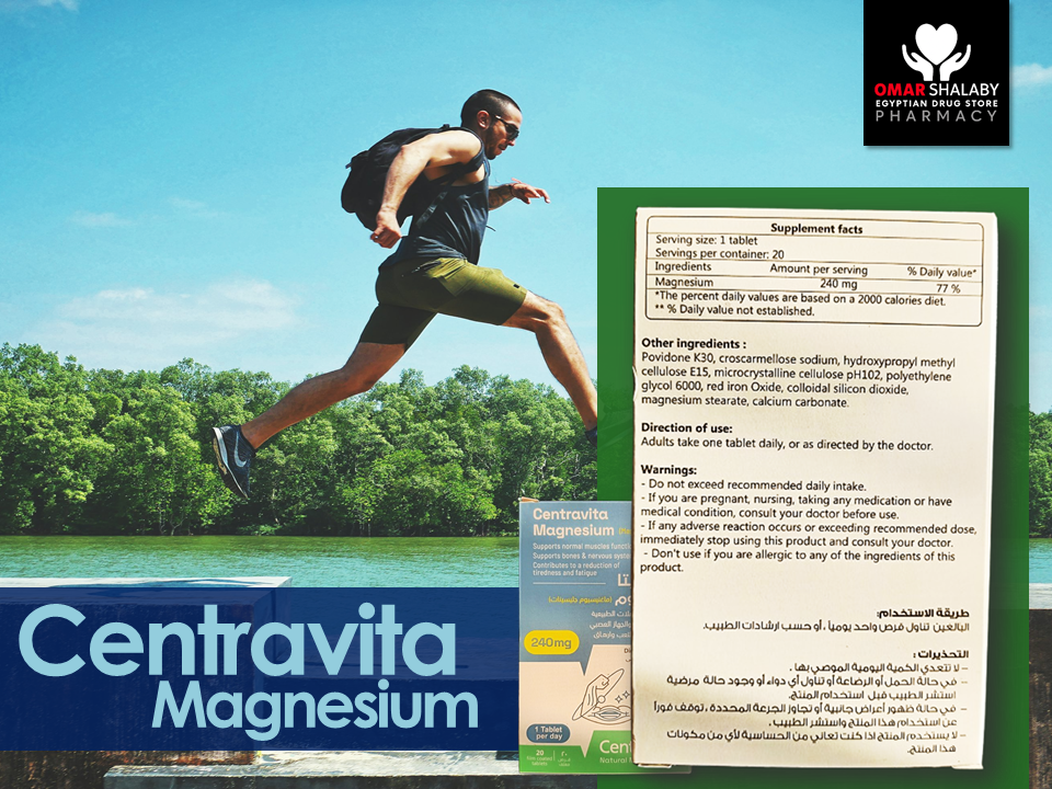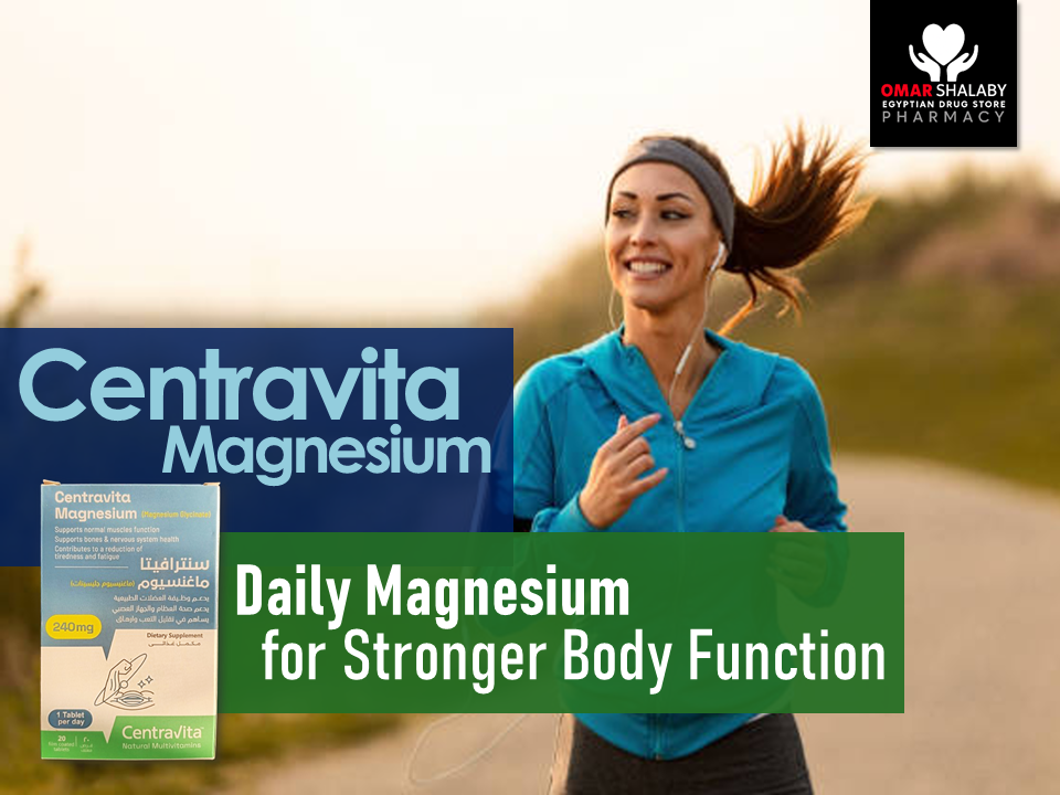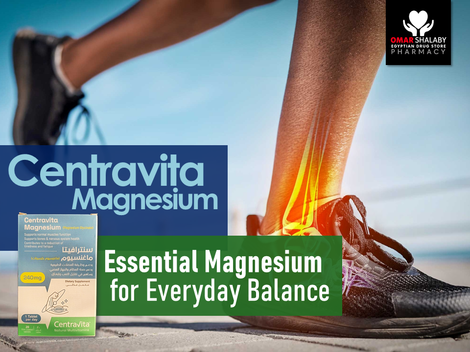Centravita Magnesium provides Magnesium 240 mg, an essential mineral involved in many vital physiological functions. Magnesium supports normal muscle and nerve function, contributes to energy production and electrolyte balance, and plays a key role in bone health. Adequate magnesium intake also helps reduce muscle cramps and supports normal cardiovascular function.