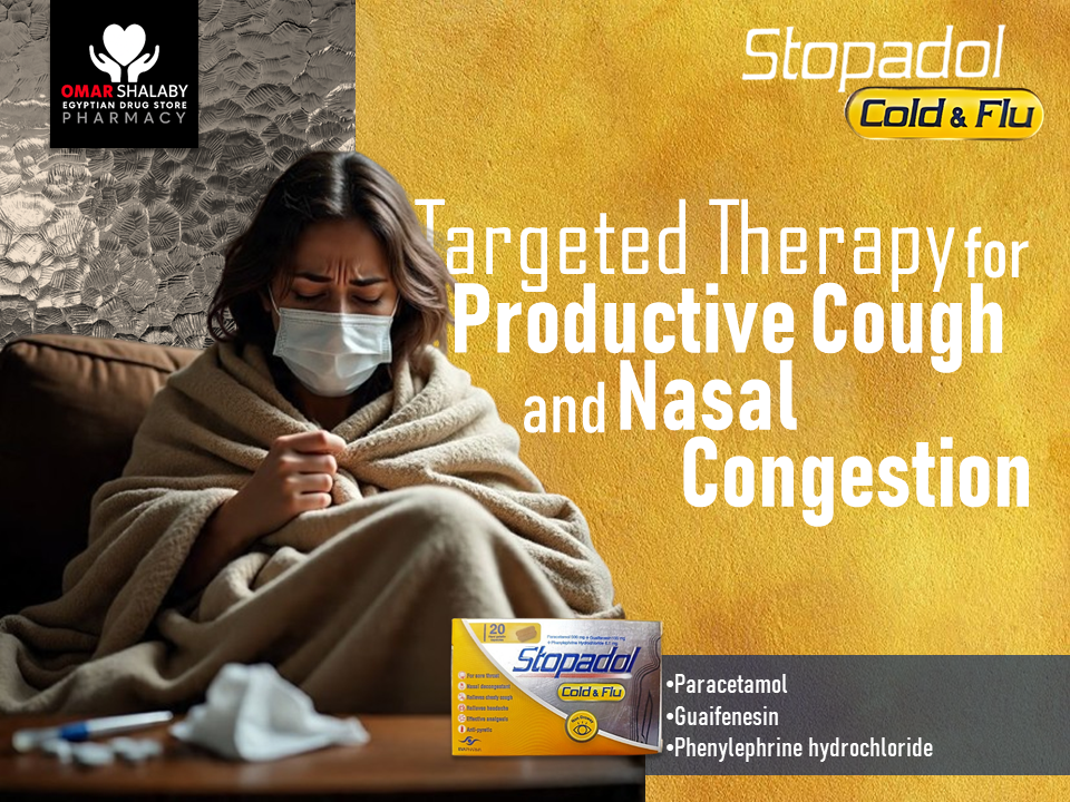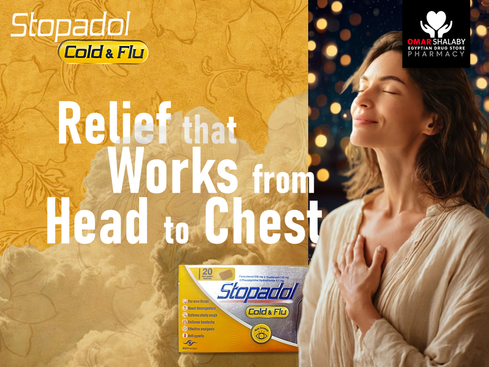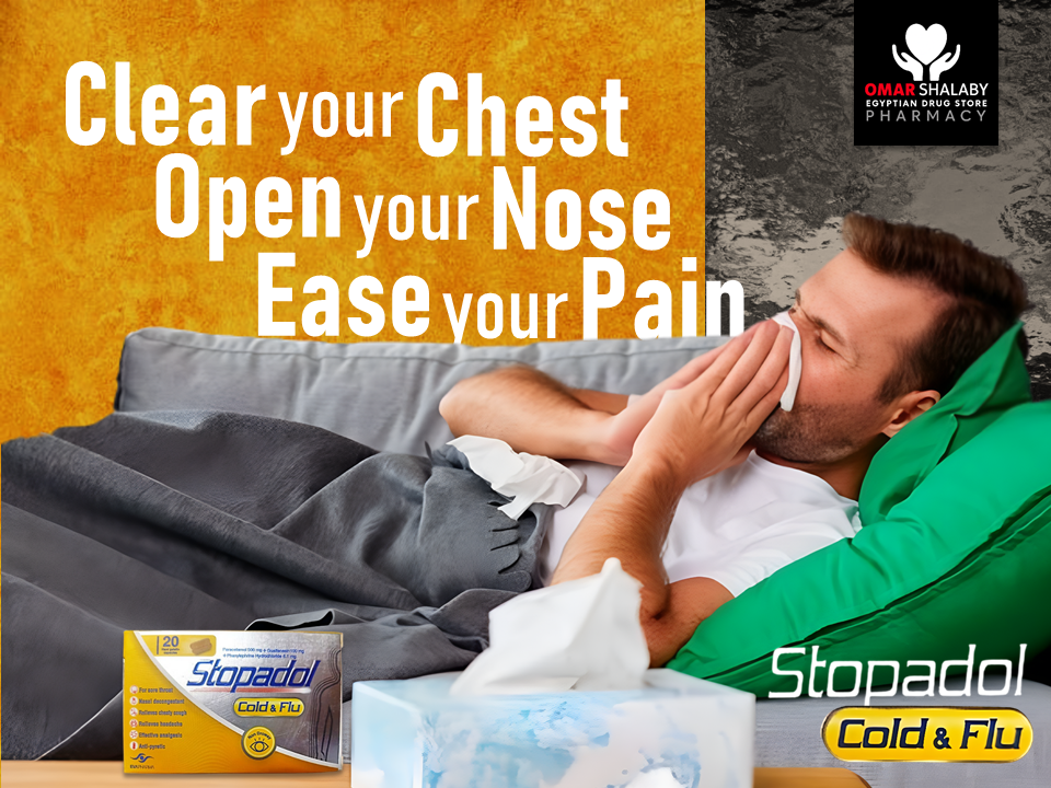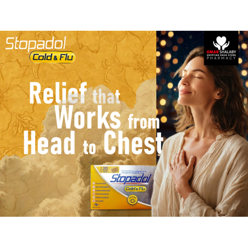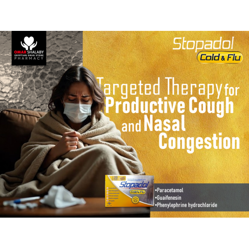 Stopadol cold & Flu is a combination oral capsule containing Paracetamol (500 mg), Guaifenesin (100 mg), and Phenylephrine hydrochloride (6.1 mg). It is used for the symptomatic relief of common cold and upper respiratory tract infections, including fever, pain, nasal congestion, and productive cough.
